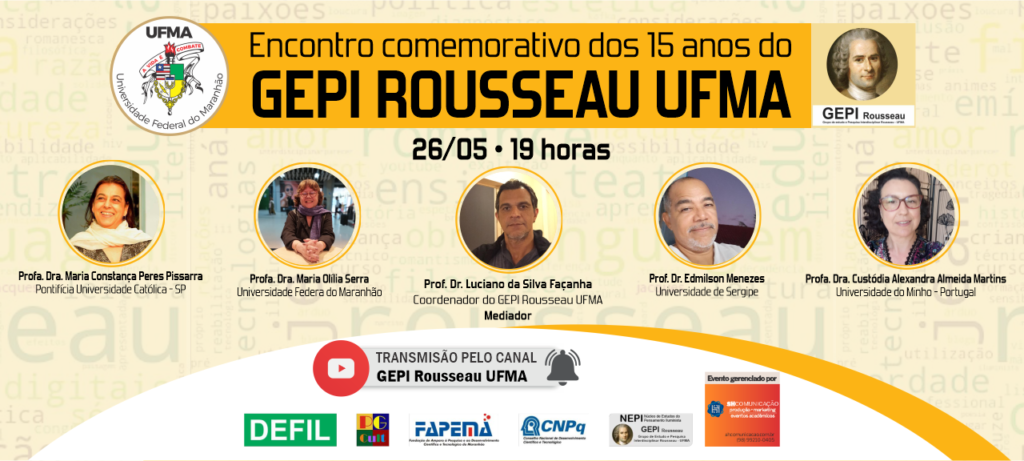 Em maio de 2021, tivemos o Encontro comemorativo dos 15 anos do GEPI ROUSSEAU UFMA/FAPEMA/CNPq, com a mediação do Professor Dr. Luciano Façanha e quatro convidados explanaram conferências comemorativas. Profa. Dra. Maria Constança Peres Pissarra PUC/SP: De uma ilha a outra; Profa. Dra. Custódia Alexandra Almeida Martins – Universidade do Minho – Portugal: Jean-Jacques Rousseau e os “espelhos da natureza”; Prof. Dr. Edmilson Menezes dos Santos (UFS): Patologias da mente e Sociedade: uma aproximação possível entre Kant e Rousseau?; Profa. Dra. Maria Olília Serra – UFMA: “Lembrai-vos do sentimento de Piedade: um imperativo de Rousseau em tempos sombrios.” O evento ocorreu pelo Canal YouTube do GEPI Rousseau UFMA: Gepi Rousseau UFMA.