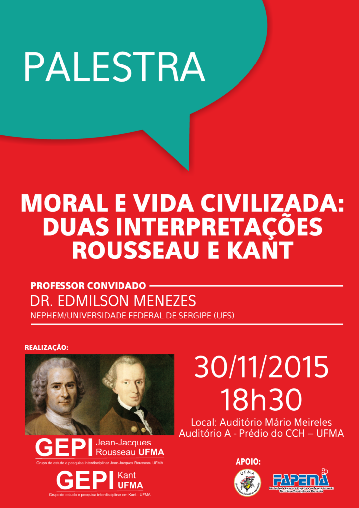 Em novembro de 2015, tivemos o evento MORAL E VIDA CIVILIZADA: DUAS INTERPRETAÇÕES ROUSSEAU E KANT, com o professor convidado Dr. Edmilson Menezes do NEPHEM/ UNIVERSIDADE DE SERGIPE – UFS, evento organizados pelos GEPIs Rousseau e Kant.